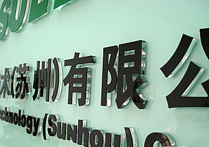 制作工藝:水晶字貼金屬片由水晶板和金屬片構成。底部的水晶板用8mm厚度的透明水晶板經(jīng)過激光切割出字形,上面的鏡面不銹鋼則用等離子切割機切割出字形,再以有機藥水固定完成。